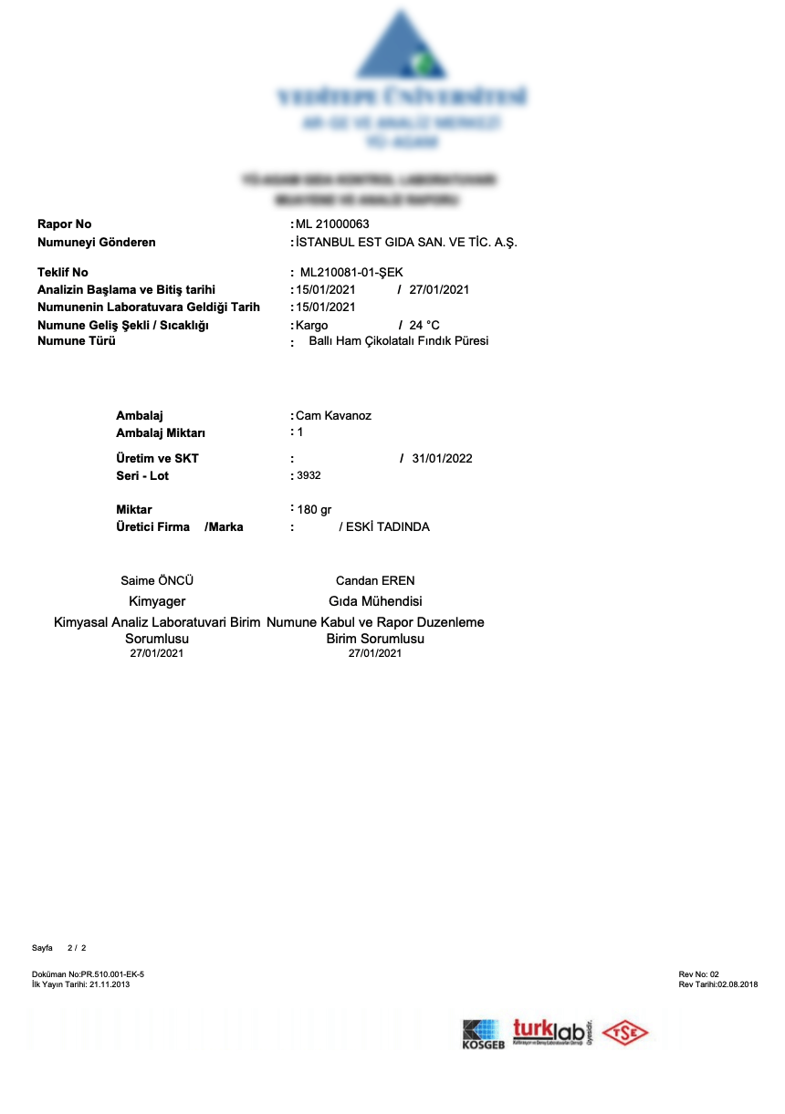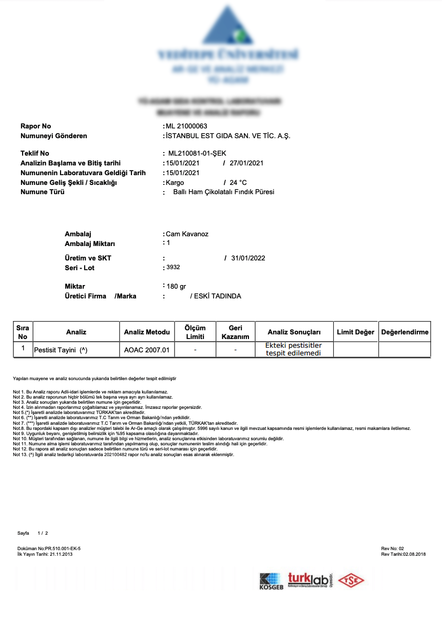 Az Şekerli Fındık Ezmesi Pestisit Testi2021 Aralık