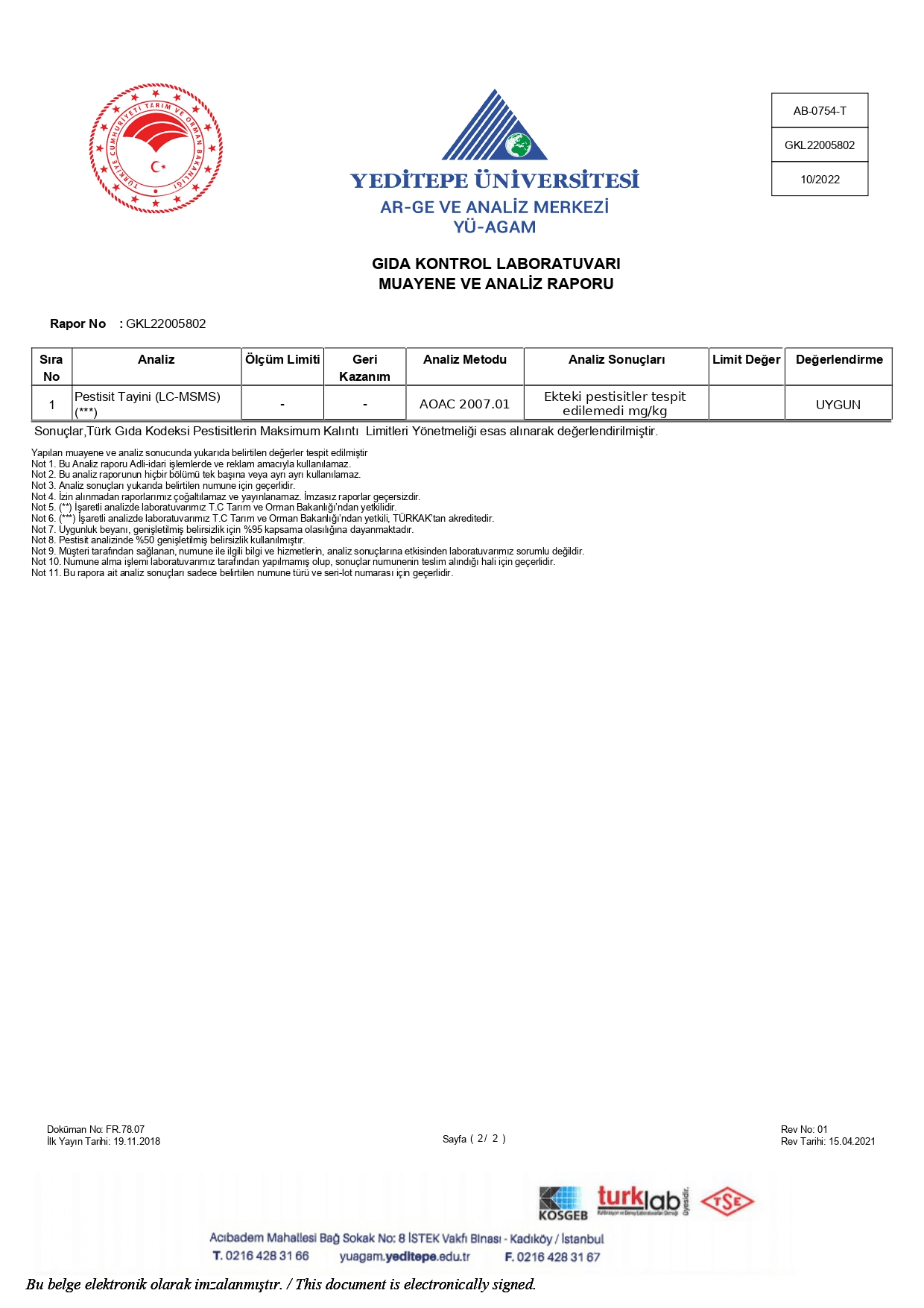 Yerli Mısır Unu Pestisit Testi2022 Ekim