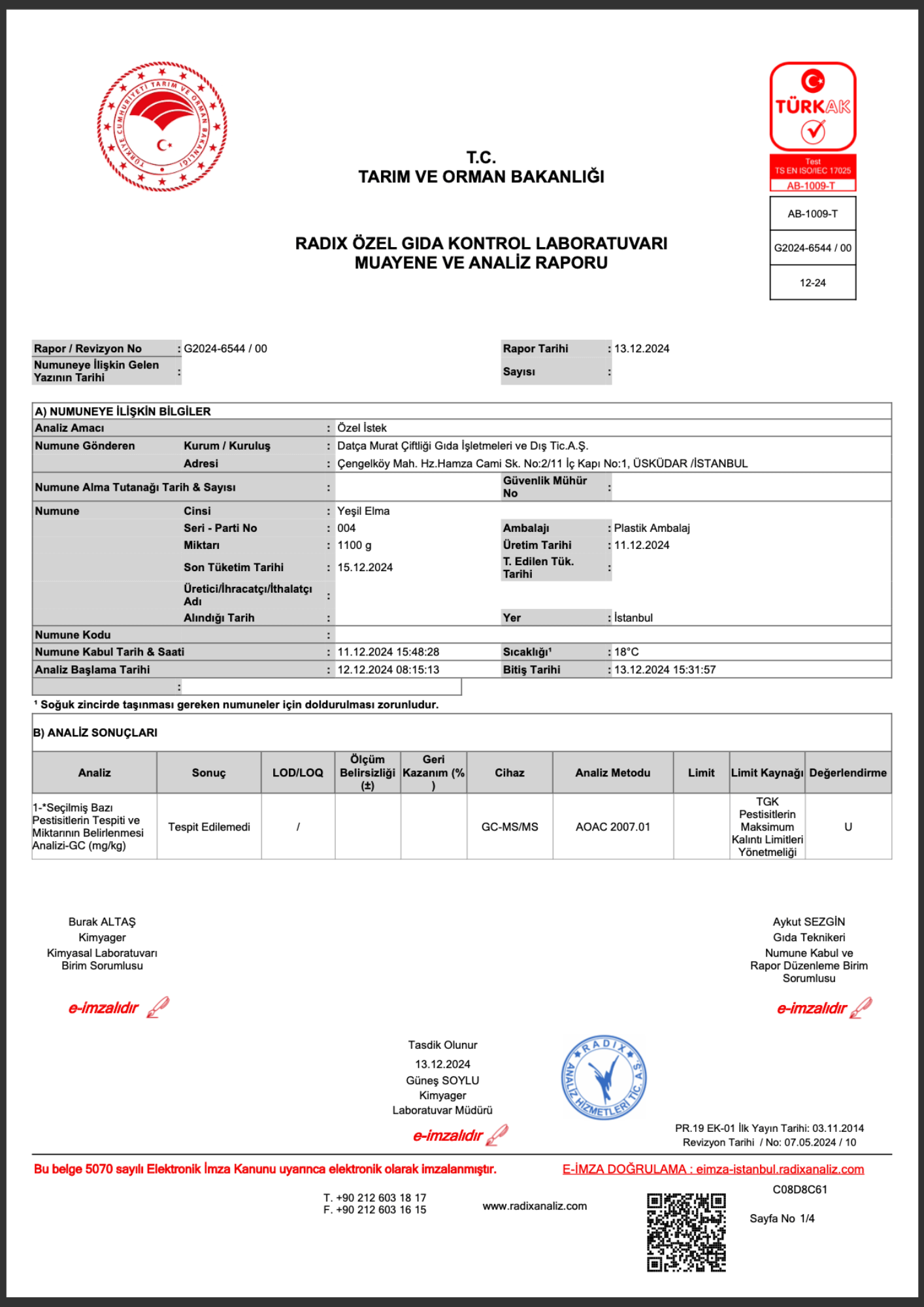 Organik Yeşil Elma Pestisit Testi2024 Aralık