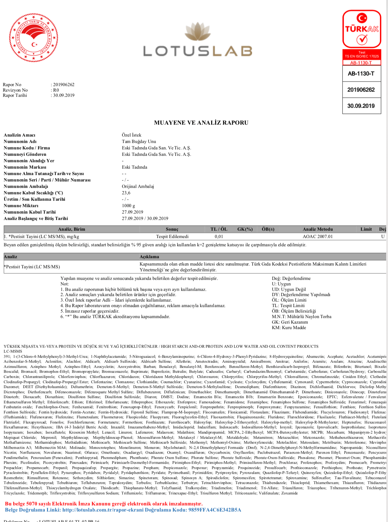 Tam Buğday Unu Pestisit Testi2019 Eylül